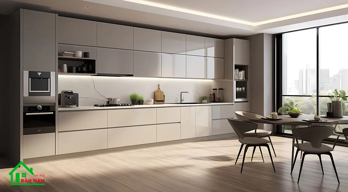 Tủ bếp laminate sử dụng vật liệu phủ laminate trên bề mặt MDF hoặc MFC. Laminate có độ bền cao, khả năng chống trầy xước và chống ẩm, làm cho tủ bếp trở nên dễ dàng bảo trì và vệ sinh. Với sự đa dạng về màu sắc và hoa văn, tủ bếp laminate mang đến sự linh hoạt trong việc thiết kế không gian bếp.