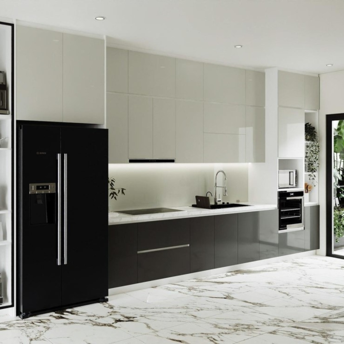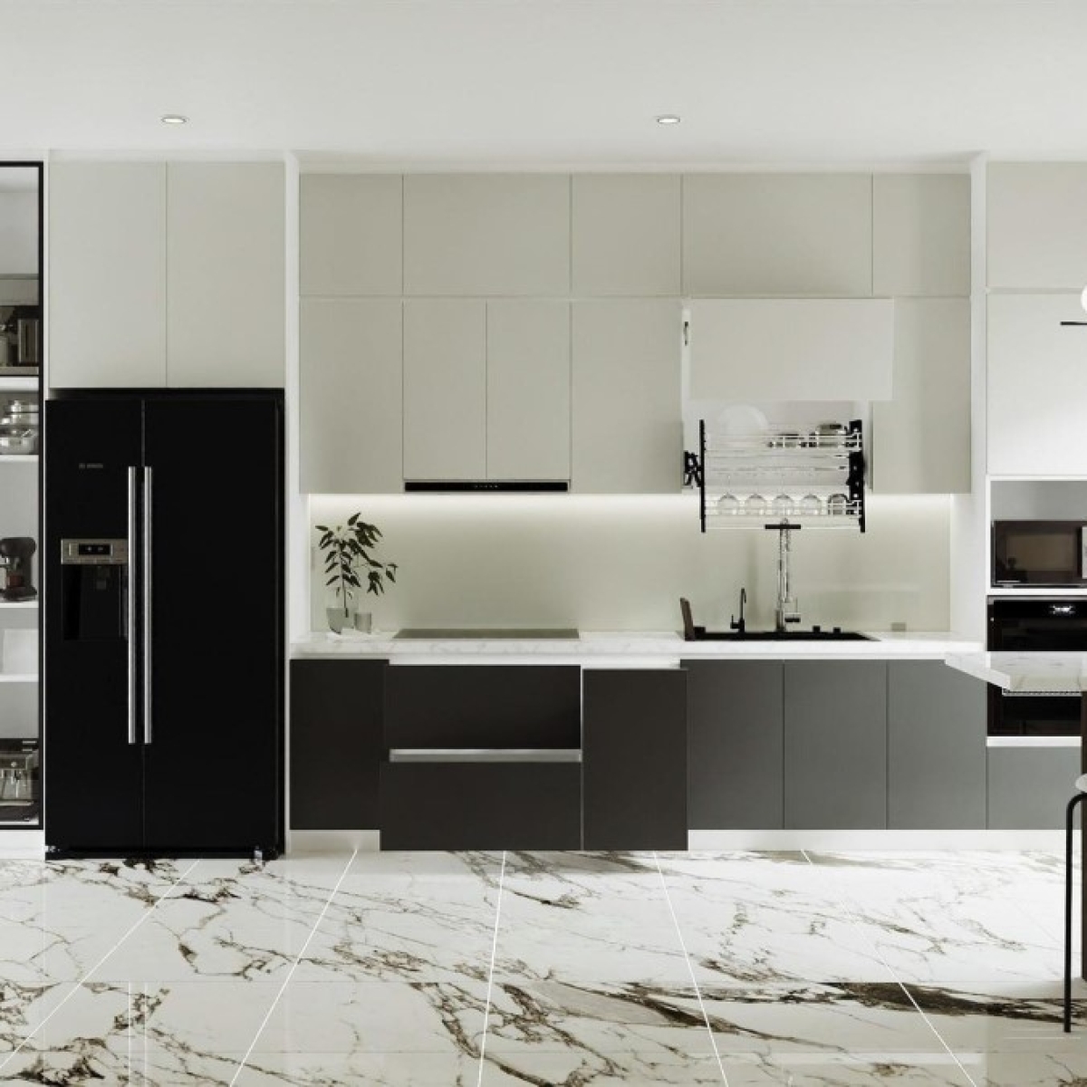 - Thiết kế chữ I hiện đại, tối ưu cho không gian bếp mở và căn hộ chung cư.