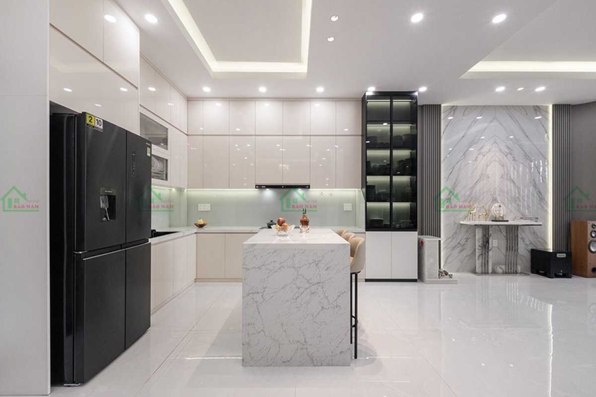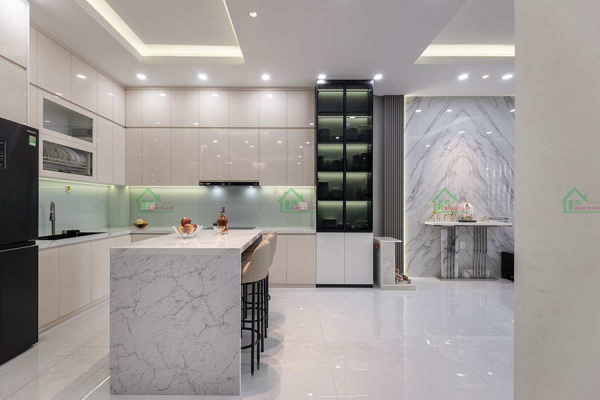 - Kiểu dáng chữ L kết hợp đảo bếp, tăng diện tích lưu trữ.