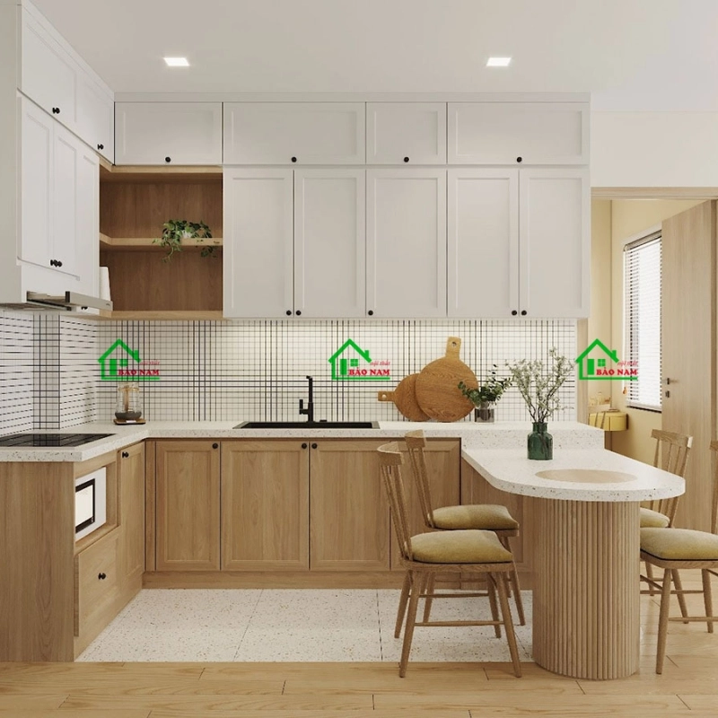 Căn bếp trong hình ảnh thể hiện một thiết kế ấn tượng, kết hợp ăn ý giữa tính năng sử dụng và yếu tố thẩm mỹ. Nổi bật là tủ bếp có thiết kế chữ L, mang phong cách vintage với tông màu gỗ ấm áp. Tủ bếp trên sử dụng cánh tủ màu trắng với kiểu dáng Shaker, tạo sự nhẹ nhàng và hiện đại, trong khi góc L được thiết kế không cánh, lộ rõ vân gỗ đồng bộ với tủ bếp dưới.