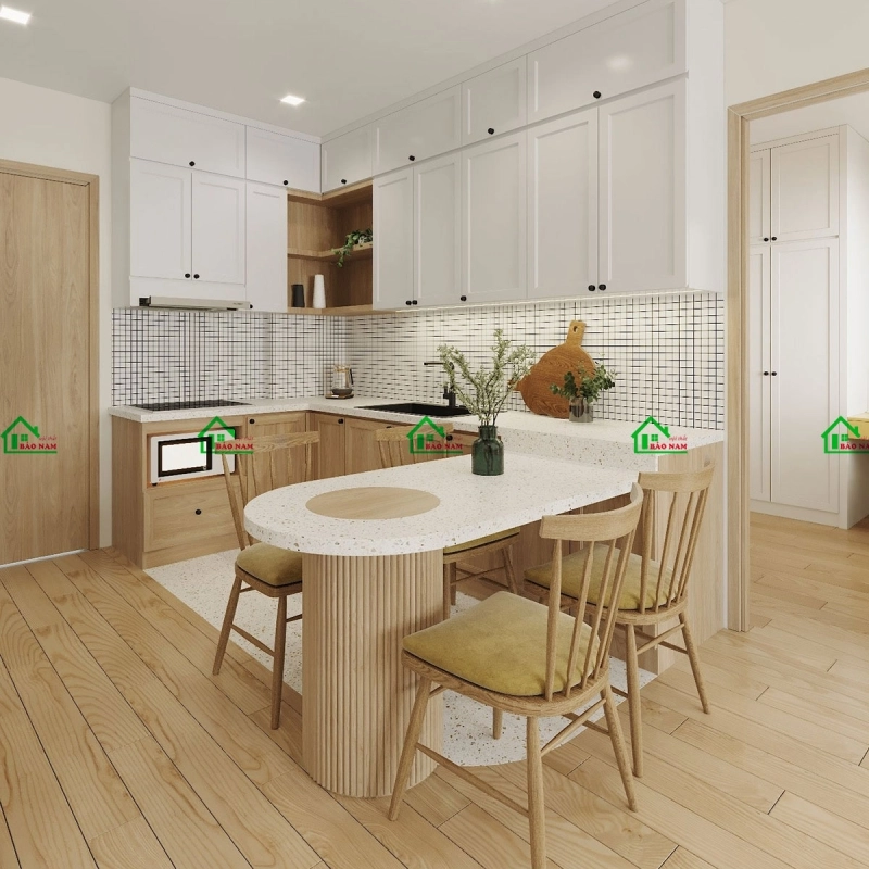 Điểm nhấn đặc biệt là việc sử dụng tay nắm núm tròn màu đen, tạo sự sinh động và thu hút. Mặt bàn đá granite sang trọng, kết hợp với bàn ăn có mặt đá cùng chân tròn vân gỗ đồng bộ, mang lại sự tinh tế và đồng nhất. Ốp tường bằng gạch ô vuông trang trí góp phần hoàn thiện không gian bếp với phong cách Vintage. Tổng thể, căn bếp này thể hiện sự kết hợp hài hòa giữa tính năng thực dụng và yếu tố thẩm mỹ, mang đến một không gian nấu nướng hiện đại, ấm cúng và đẹp mắt.