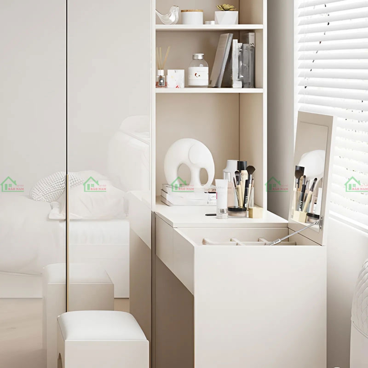 - Lưu trữ thông minh – tối ưu diện tích: Khoang treo, ngăn gấp, hộc phụ kiện và kệ decor sắp xếp khoa học; bàn trang điểm liền tủ tích hợp gương mở tiện lợi.